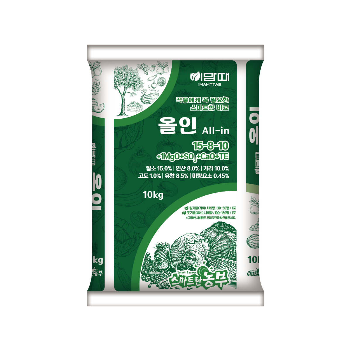 수확물의 품질과 수확량 증대에 기여하고 염류집적과 토양오염 예방을 통한 친환경 농업의 실현을 위해 개발된 특수 기능성 비료이며 질소, 인산, 가리 이외에 고토, 유황, 미량요소가 함축된 완전 비료 이맘때올인에 포함된 DMPP 성분은 과잉흡수를 억제하고 용탈방지를 예방해 줍니다.